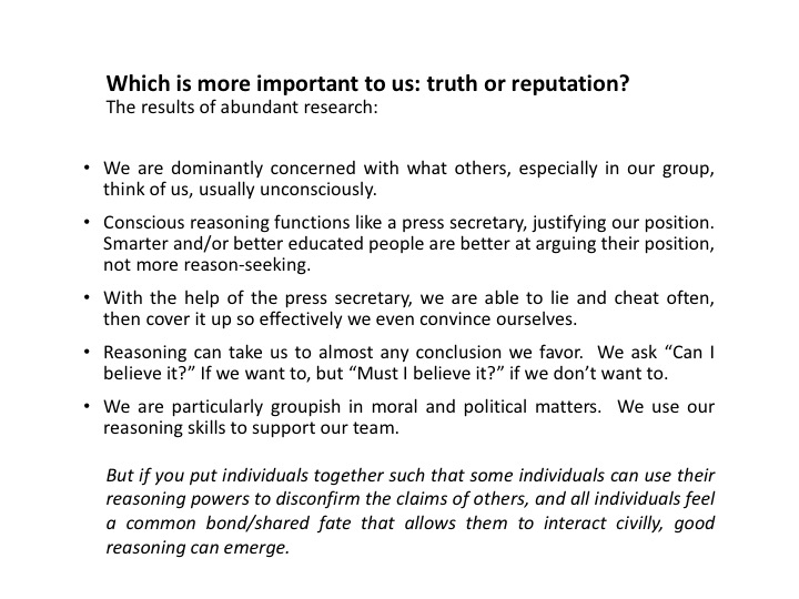 • But if you put individuals together such that some individuals can use their reasoning powers to disconfirm the claims of others, and all individuals feel a common bond/shared fate that allows them to interact civilly, good reasoning can emerge.