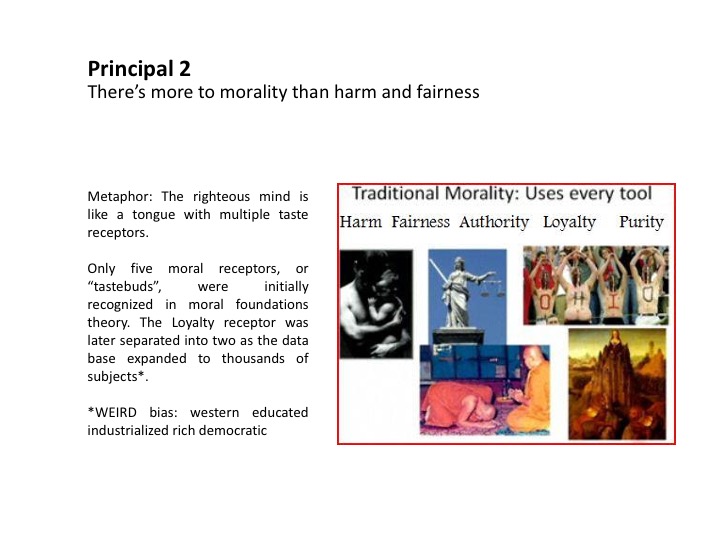 There is more to morality than harm and fairness. People have many powerful moral intuitions. Six moral foundations, or “receptors”, are now identified.